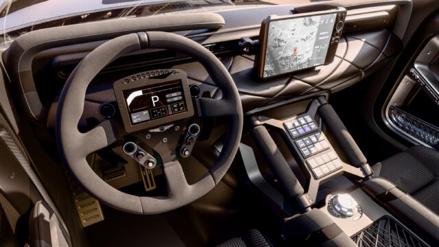 A digital instrument cluster is integrated directly into the steering wheel, while the infotainment display slides horizontally to position it for either the driver or the co-pilot, depending on navigation needs. The result is a cabin that looks as if it were designed for both performance and long days in harsh environments.
