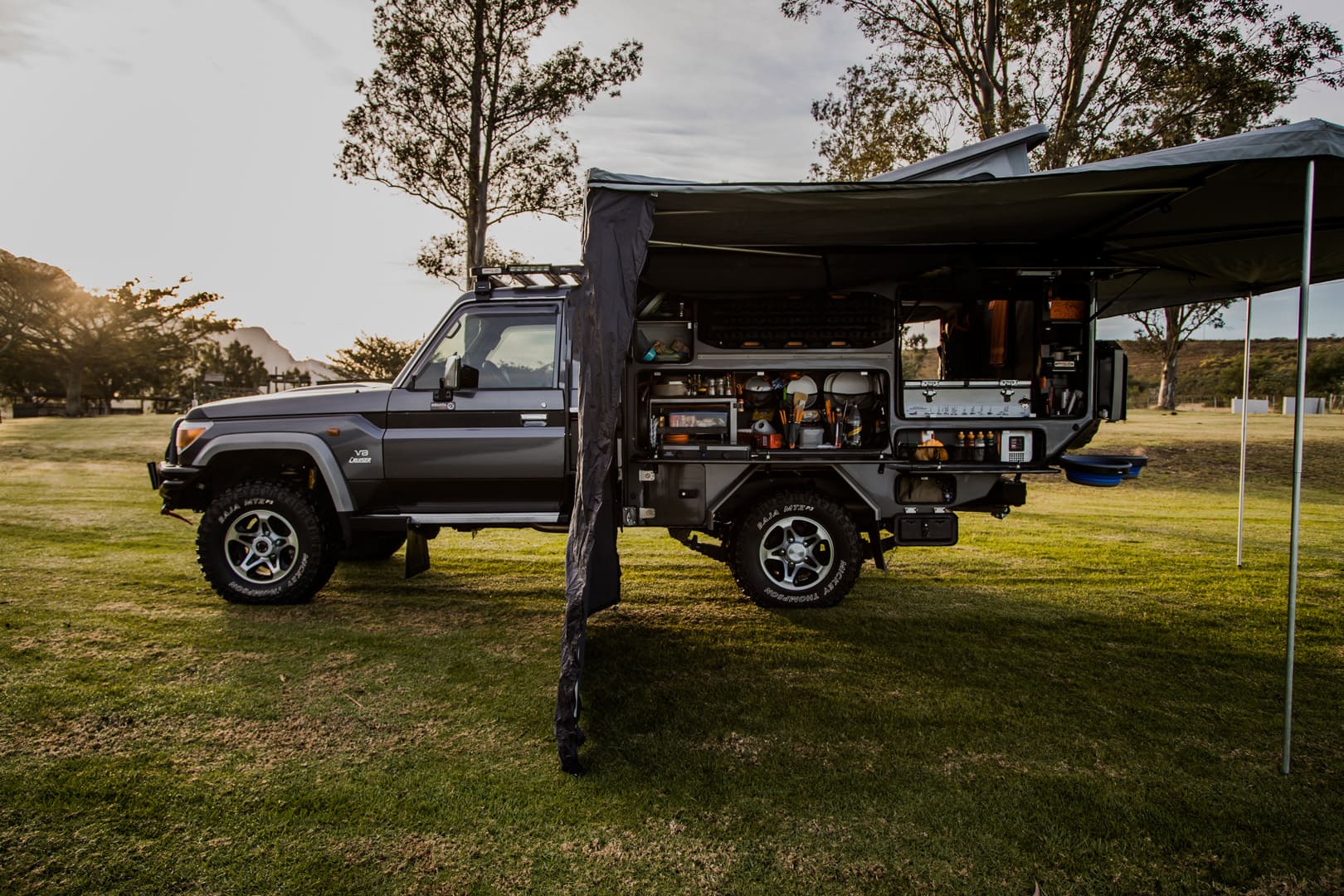 We parked our Land Rover beside a new BMW 1200 GS and stepped into the showroom to be greeted by a friendly salesman and the coolest Land Cruiser camper we have ever seen. I am a lifelong Landy man, but, to be honest, the Land Cruiser pickup has always given me “the fizz,” and this shiny new Cruiser with Inkuzi camper was fizzy indeed. Infanta 4×4 built the lightweight camper from scratch, and we were amazed by the attention to detail, the high-tech materials, and the innovative solutions to overland travel requirements. The Inkunzi, which means “bull” in the Zulu language, is a serious-looking bull that is ready to tackle the toughest terrain comfortably and with a hard head. At the touch of a button, the roof pops up, and a side wall slides out to reveal a double bed. A porta potti slides out from under the bed, and a shower cubicle can quickly be opened for a hot shower. A kitchen area houses all the essentials, and a fridge slides out to offer cool refreshments after a claimed three-minute total camper set up. What more could you possibly ask for?