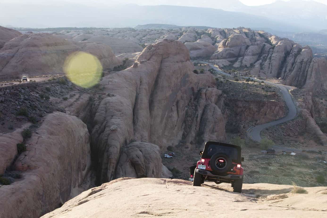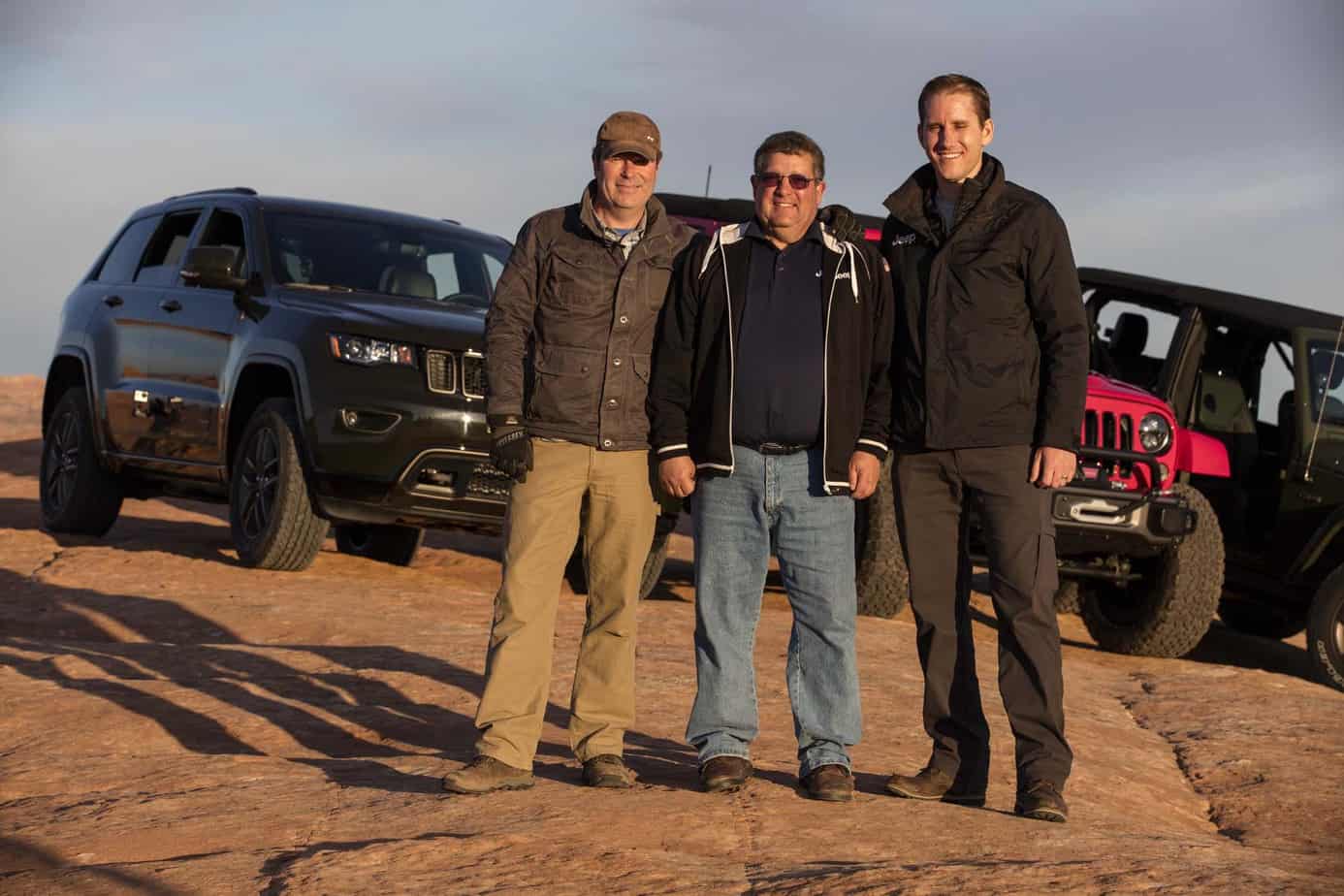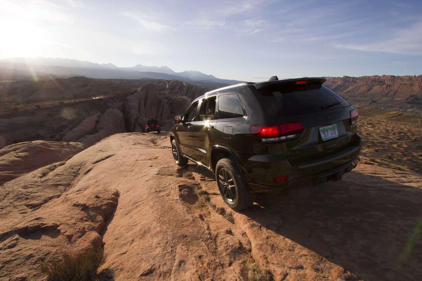 With the aforementioned anniversaries at hand, a small group of Jeep executives got together with Michael Badger, the private landowner, and spun the idea of releasing the lion one last time. In the following morning’s pre-dawn light, a 75th Anniversary Edition Grand Cherokee and two-door Wrangler nosed up to its 45-plus degree sandstone tail; the third member of the fleet was a limited edition Wrangler Red Rock. At the steering wheels were Jeep’s Tyler Ruby, Mark Allen, and Jim Repp. (It’s great when the guys that run the company love Jeeping as much as we do). It was the first time on Lion’s Back for Ruby (return trips for Allen and Repp), and spirits were high. Allen picked a line up the center, slipped the 75th Anniversary Wrangler in gear, and led the procession on a last ascent to the summit. The sun peeked over the La Sal Mountains as the team negotiated a multi-point turn at the top, casting brilliant hues over the Arches and Canyonlands National Parks and greater Moab valley. It was a glorious moment to celebrate.
