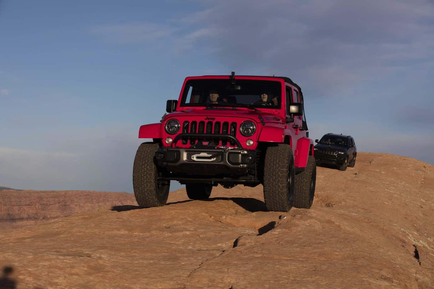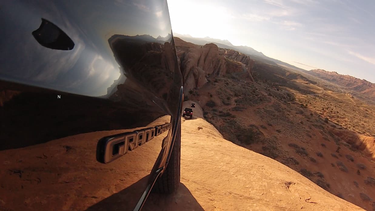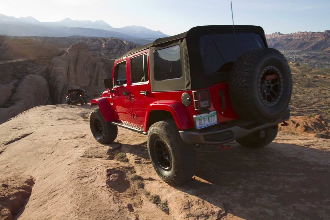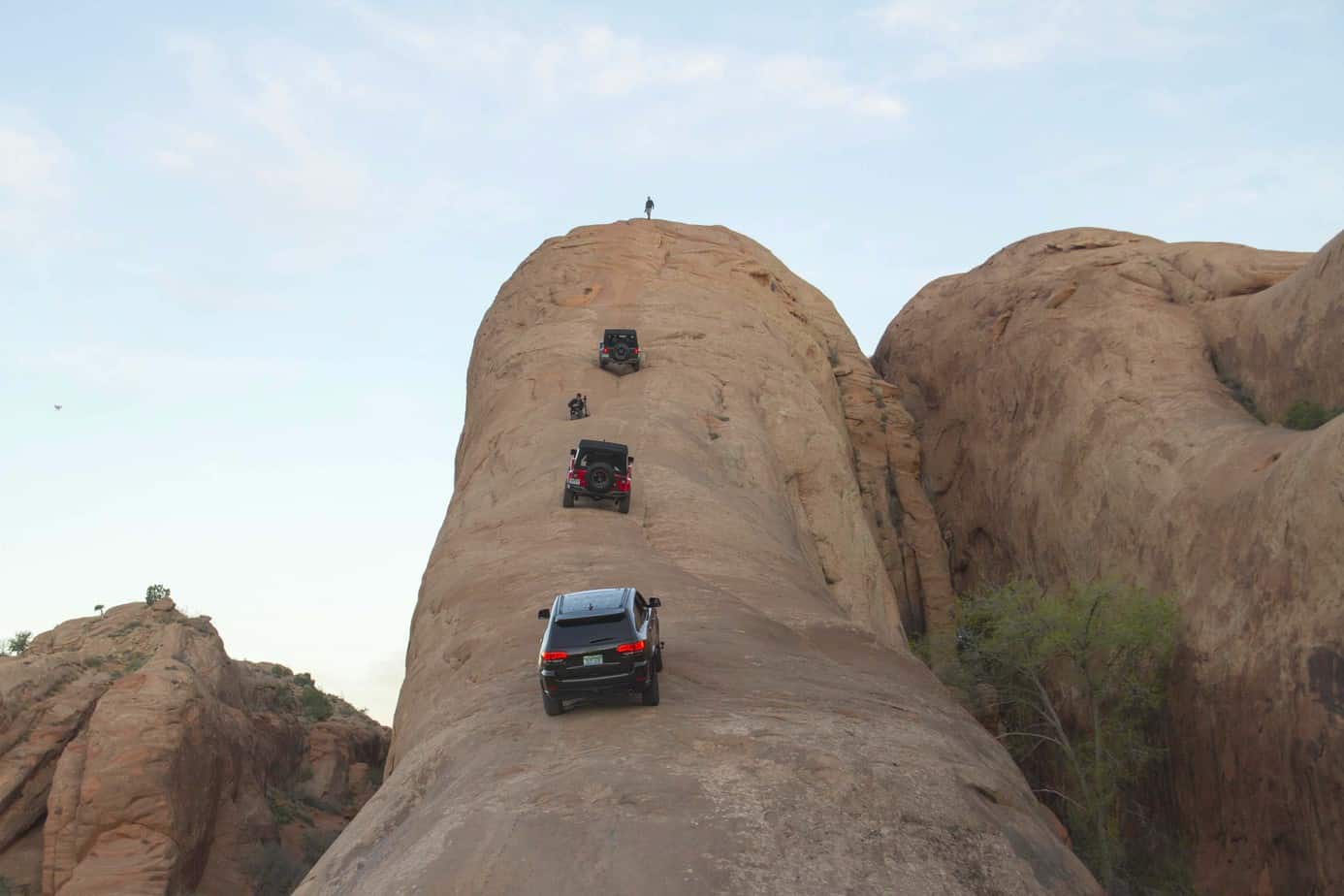 With the aforementioned anniversaries at hand, a small group of Jeep executives got together with Michael Badger, the private landowner, and spun the idea of releasing the lion one last time. In the following morning’s pre-dawn light, a 75th Anniversary Edition Grand Cherokee and two-door Wrangler nosed up to its 45-plus degree sandstone tail; the third member of the fleet was a limited edition Wrangler Red Rock. At the steering wheels were Jeep’s Tyler Ruby, Mark Allen, and Jim Repp. (It’s great when the guys that run the company love Jeeping as much as we do). It was the first time on Lion’s Back for Ruby (return trips for Allen and Repp), and spirits were high. Allen picked a line up the center, slipped the 75th Anniversary Wrangler in gear, and led the procession on a last ascent to the summit. The sun peeked over the La Sal Mountains as the team negotiated a multi-point turn at the top, casting brilliant hues over the Arches and Canyonlands National Parks and greater Moab valley. It was a glorious moment to celebrate.