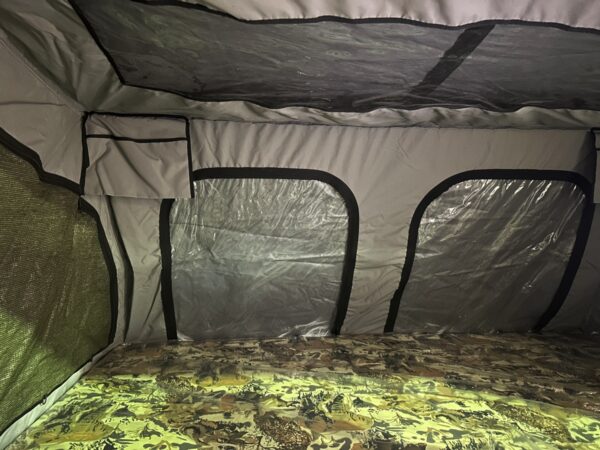 Constructed from robust 260GSM ripstop canvas, the Galaxy tent’s large dual windows and clear PVC in the roof offer excellent ventilation and stargazing opportunities, hence the name. Enhanced with a 70mm laminated high-density mattress (with a uniquely African wildlife-inspired cover), flysheet, two storage pockets per side, and an aluminum extruded ladder, Eezi-Awn has engineered this tent to combine comfort and convenience.