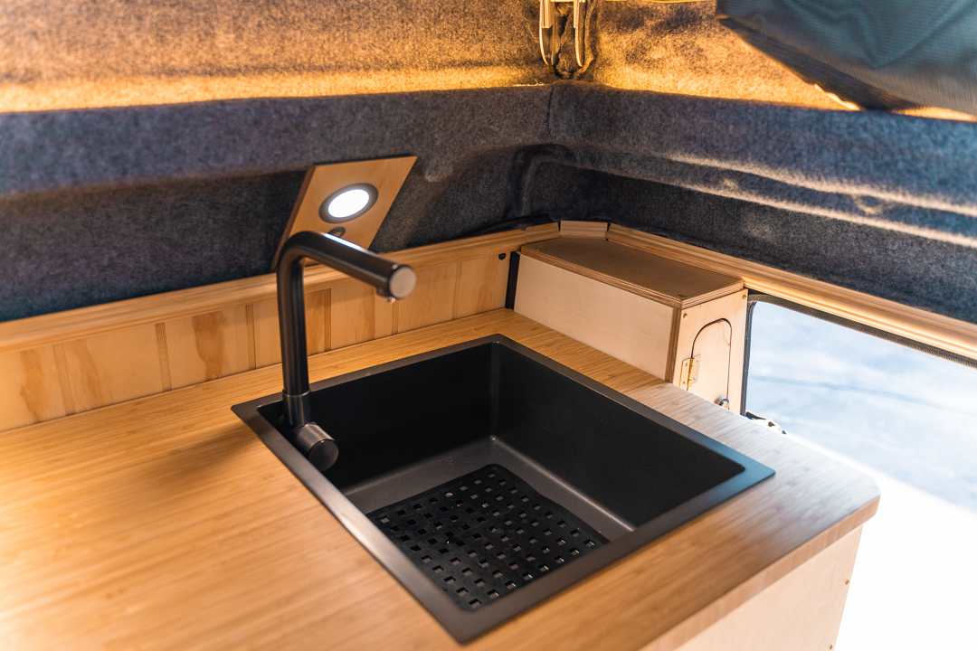 Chris cut the roof of the truck and installed a custom Bundutec BunduTop conversion to create standing room in the camper interior. The system is electric, raising and lowering the pop-top at the push of a button. This feature transforms the truck body into a spacious kitchen, complete with cabinetry, an induction cooktop, a Womo water filtration system, and a Dometic NRX 115C fridge. The couple also installed a wine rack, which, they admit, houses more almond milk than cheap bottles of Spanish wine. The whole shebang is powered by two 200-amp-hour lithium batteries, five 100-watt flexible solar panels, and a 2,600-watt Dometic Enerdrive inverter.