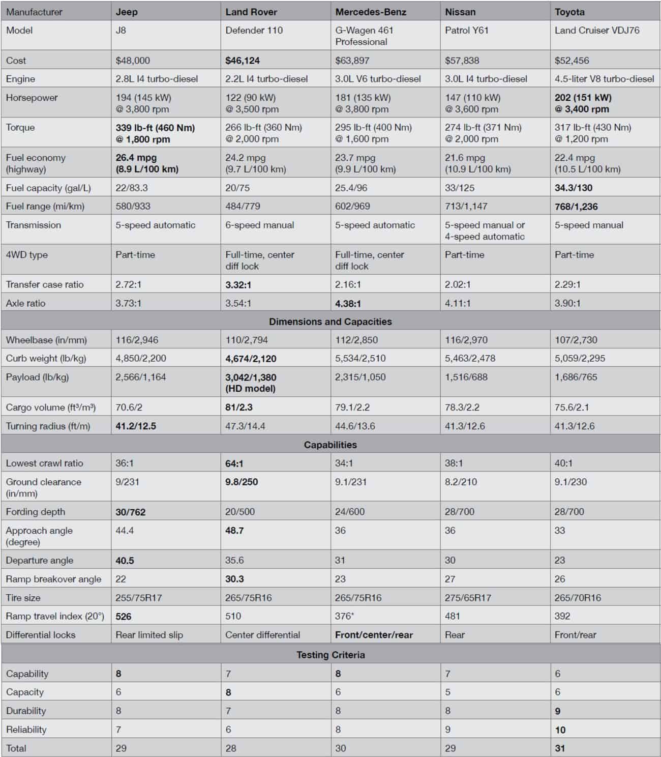 The Patrol, with its massive axles and thoroughly livable cabin, is a fantastic platform, yet the company neutered it with a wimpy motor and Suzuki Samurai-sized clutch. The Nissan represents an excellent value, and once the clutch has been upgraded (or the buyer chooses an automatic), the Patrol will provide decades of service. The Defender is ever charming, but you would think that Solihull would finally center the steering wheel in front of the driver, fit it with a traction device, and keep rain from coming in the door seals. However, no adventure vehicle ever assembled will look as brilliant as a backlit 110 in the Kalahari. The Defender is the emotional victor, defying any specification or test result. Interestingly, the Jeep J8 is the most squared-away of the bunch, but they failed to include optional differential locks and a sway bar disconnect—not that this matters much, as it is nearly impossible to obtain a J8 without invading Egypt. The Jeep also suffers from limited interior volume and the lack of a service network outside of the First World.