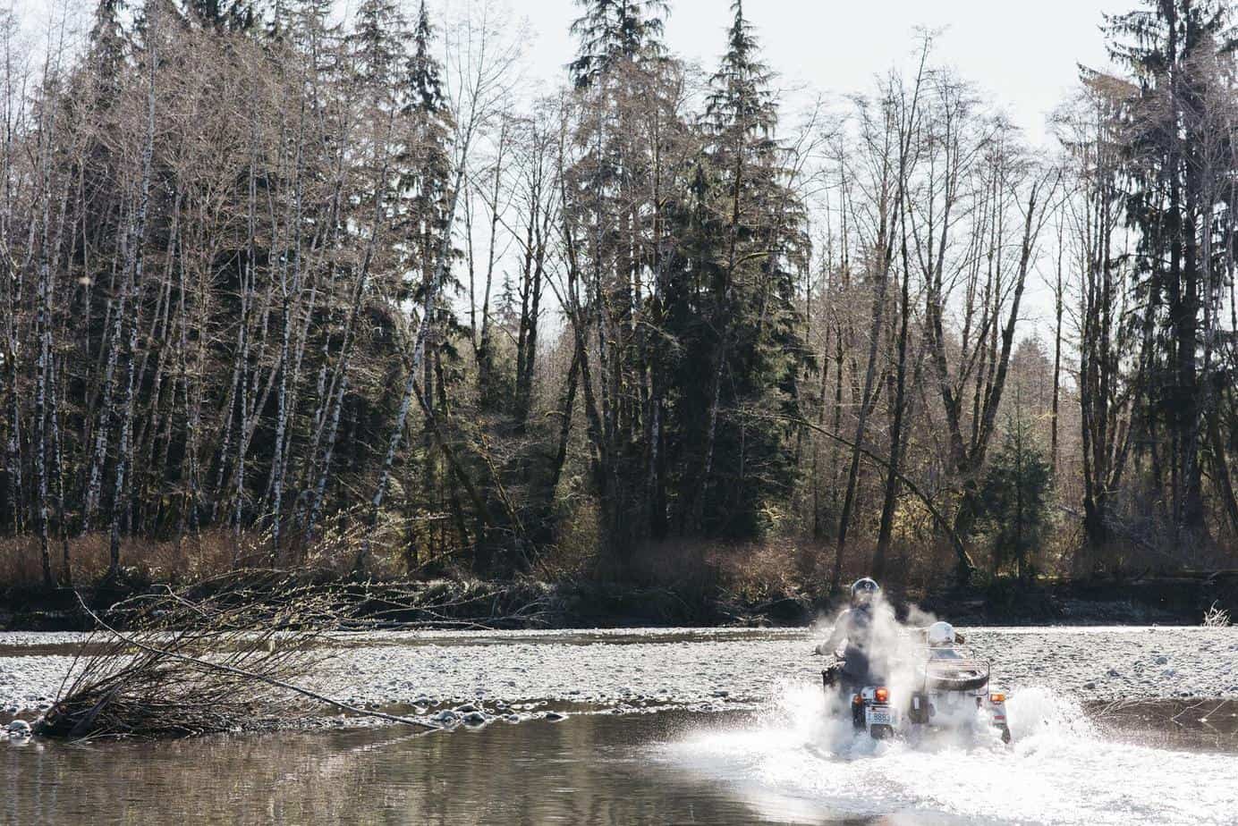 A sidecar displaces a lot of water. Like a gas-powered flume ride, we kicked up a magnificent spray that nearly engulfed us as we barreled through the shallows. When we arrived at the mid-river sandbar we were heading for, we made two important discoveries. The first was that the temperature of the Bogachiel River in March is as close to liquid ice as the laws of thermodynamics will allow, and secondly, that we had taken on quite a bit of water. Thankfully, there is a small drainage hole underneath the floor mat. Apparently, this sort of ill-conceived amphibious usage was something Ural engineers had anticipated. We spent the next couple of hours racing about the riverbanks trying to “not get stuck” before finally returning to collect Kyle.