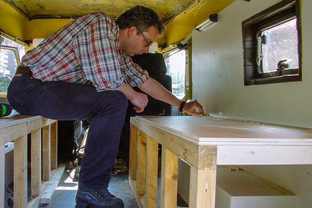 The interior was (and still is) simple with two benches for our stuff and planks to put in the middle to make the entire rear into a big bed. The intention was to leave the middle part empty. Due to a total lack of planning and packing, that part got jammed with the too-big table, chairs, and other stuff. Over the years, we have done some renovations, and the interior has become more comfy and spacious. This is nice in the colder climate we are currently traveling in but wasn’t necessary during those first years of traveling in the tropics.