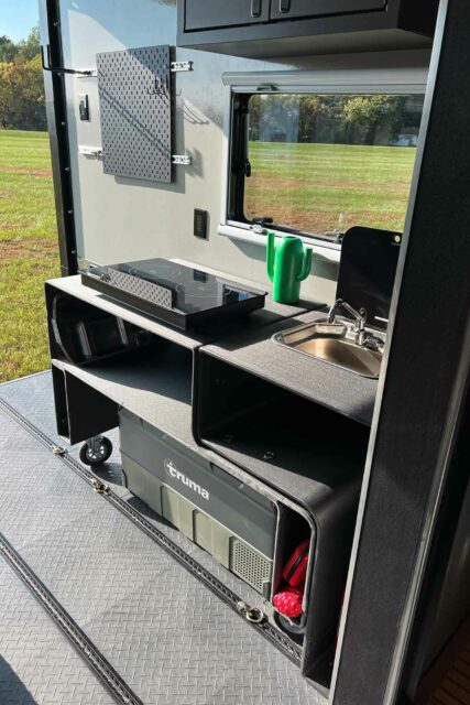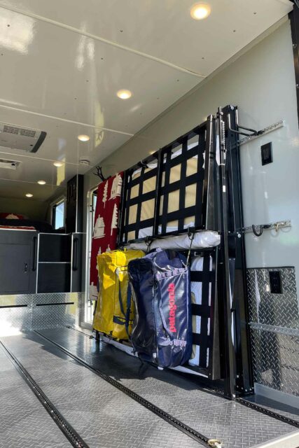 The liftgate also serves as a ramp for rolling in or out the removable kitchen cart, motorcycles, an ATV, a full-size snowmobile, or any necessary work equipment. Inside, the Silver Spear comes equipped with a wet bath, a 25-gallon dual-zone cooler, a two-burner propane cooktop, five solar panels, a 60-gallon freshwater tank, a 30-gallon greywater tank, a composting toilet, a permanent sink, and abundant storage. You can use the interior and exterior mounting rails to customize your adventure cargo for any climate or activity.