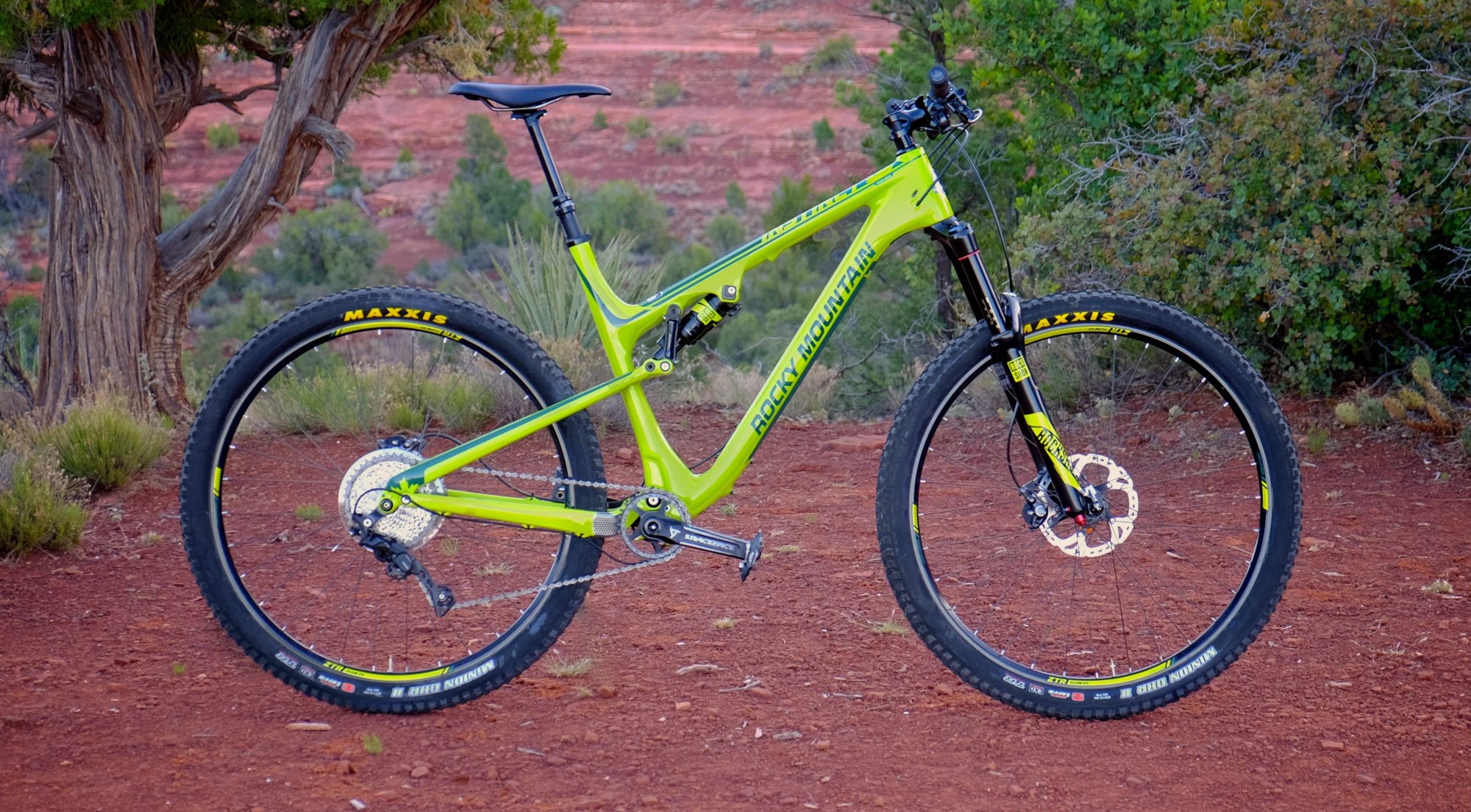 Delivering the 2.3-inch Maxxis Minion tires to the ground are Stan’s hubs and ZTR Flow EX rims laced together with Sapim spokes. The end result is a set of wheels with the level of stiffness Rocky Mountain’s ride ambassadors demanded of a strong and precise wheel package, and they are point-and-shoot accurate.