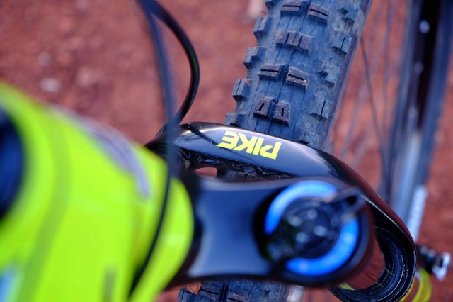 Built around Rocky Mountain’s Smoothwall carbon fiber frame complete with carbon seat and chain stays, the Instinct uses the brand’s unique Ride-9 adjustable suspension and geometry chip-set to permit finite tuning of the bike’s trail qualities. With the removal of just one pivot bolt, two independent mounting plates can be rotated to one of nine positions to modify the angles, effect the bottom bracket height, or otherwise make the bike sing your own tune. The Ride-9 system can even modify the shock progression, further adding to the fine tuning. Putting all of that suspension magic into motion is a Rockshox Pike RCT3 140mm fork and a Rockshox Monarch RT3 custom valved shock unit.