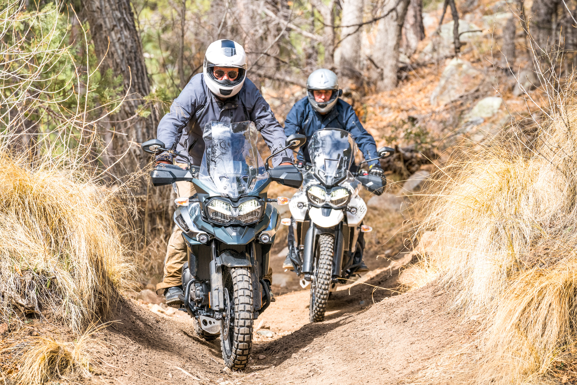 The big adventure bikes are getting so much better in the dirt, and the 1200 Tiger XCA is no exception. The previous model worked well for gravel roads and moderate conditions, but the new XCA variant is truly a GS and KTM fighter. The WP suspension has 7.48 inches of suspension travel (7.6 rear) and the benefit of extensive valving and spring-rate adjustments. The Tiger no longer bottoms easy and generally stays securely planted, even in technical terrain. We exposed the model to rocks, ruts, water bars, low traction DG, and deep water crossings. The new rider modes allow for Off-Road and Off-Road Pro, which calibrates wheelspin control via traction control and braking ABS. I found both to work well and you can still go full manual and turn everything off. Our test model had aggressive Pirelli Scorpion knobbies front and rear, which also aided in the tractability and lateral grip on the dirt. Other items of note are the full-size aluminum pegs, factory skid plate, and crash bars. The XCA is also 22 pounds lighter than the outgoing model, and the controls provide better modulation and a lighter overall feel.