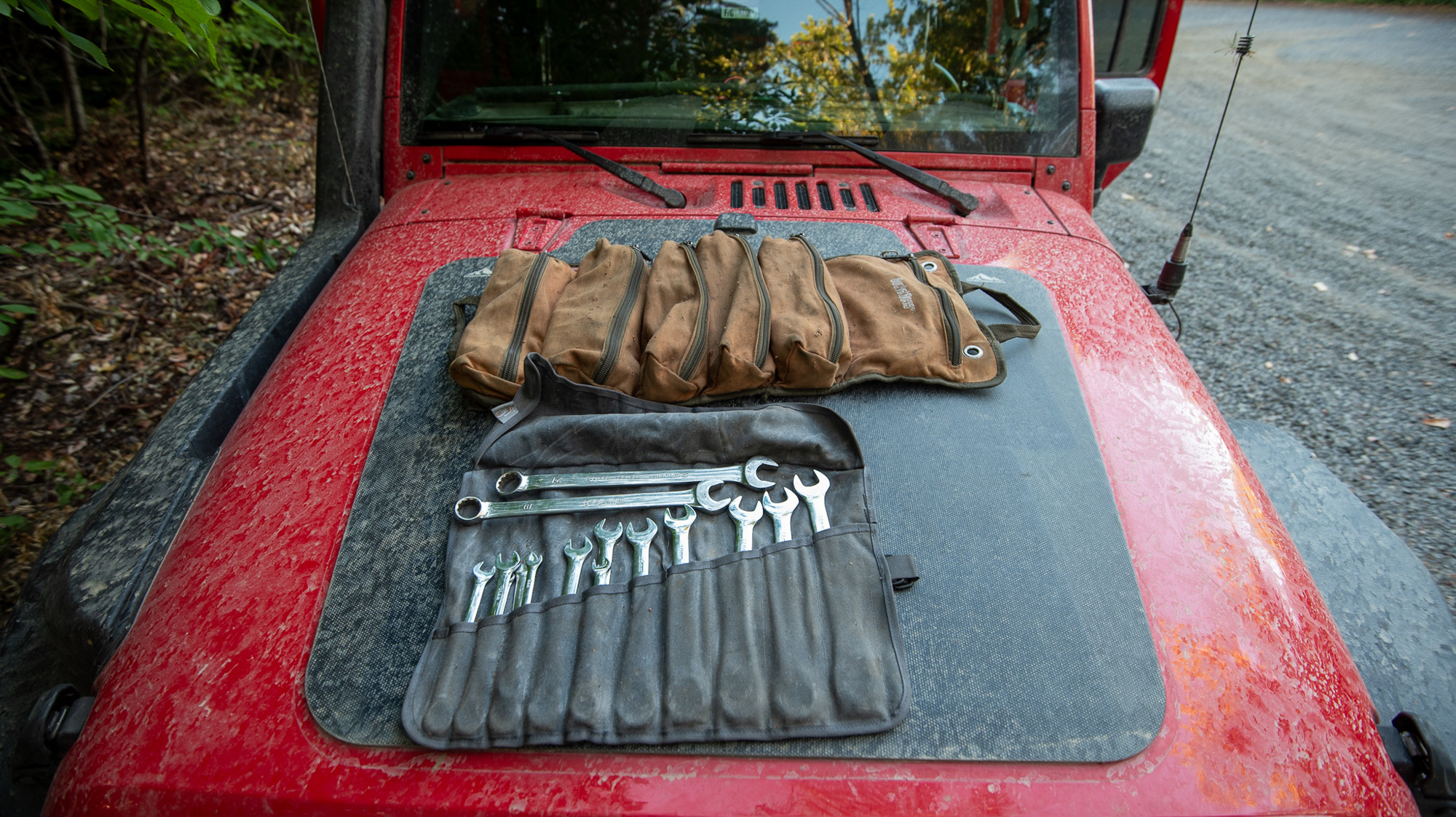 We keep our tools in a Last US Bag Waximillion tool roll and a Bucket Boss Super Roll. We have almost every socket and wrench needed to disassemble the Jeep completely. We also keep a breaker bar, a torque wrench, and a GreenWorks 40-volt electric chainsaw tucked away in various nooks and crannies. It’s a good day on the road for Aaron if he gets the chance to clear a trail with the chainsaw.”