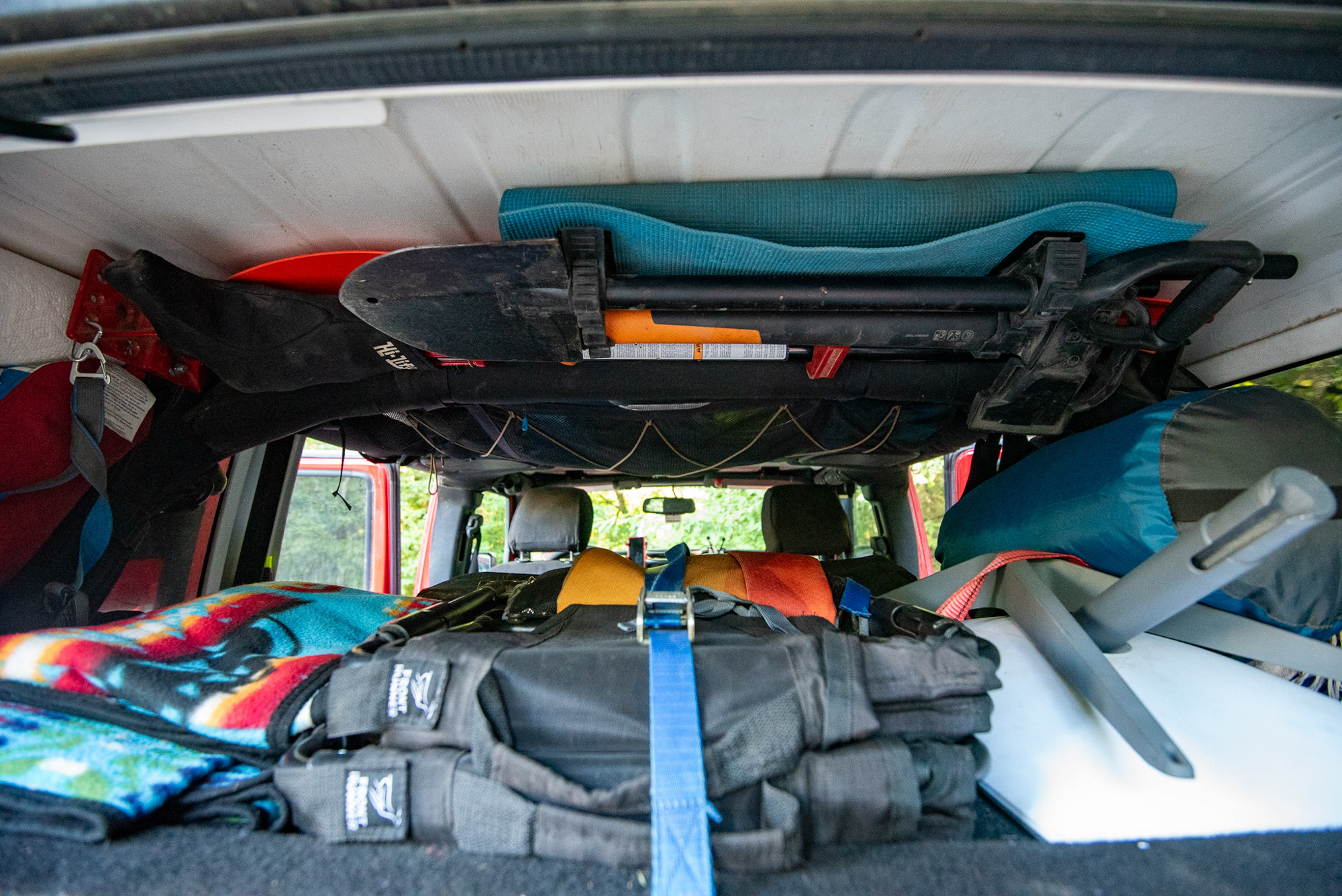 We try to use every nook and cranny of our rig efficiently. We removed the rear seats and built a two-tier false floor, giving us lots of storage room. We also have a custom-made Hi-Lift jack storage bracket connected to our roll cage in the rear of the Jeep. We store our jack, yoga mat, shovel, ax, and kayak paddles there. We have two inflatable Tahe Beach LP1 kayaks that pack up fairly small, which we’ve made space for in the back. We have a Yakima SpareRide rack on the spare tire when we want to bring our bikes along. We also love our Last US Bag seat back caddy, a set of zippered pockets that hangs behind the passenger seat. We keep sunscreen, bug spray, two-way radios, masks, and lots of other small items in there for easy access.”