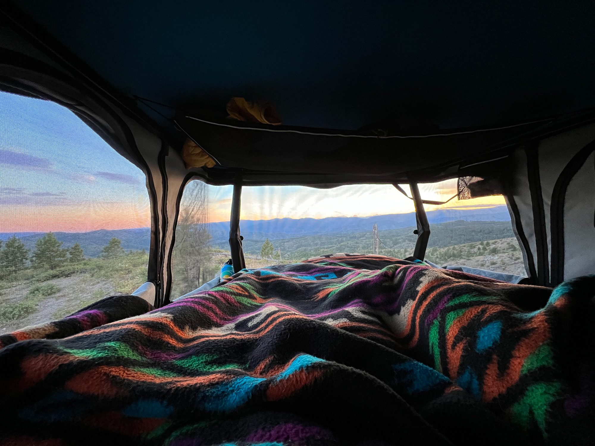 We build ourselves a nest with two sleeping bags (North Face Dolomite, 20°F), five pillows, and a beloved Navajo-crafted wool blanket we picked up in Monument Valley. We keep all of that bedding in our rooftop tent. We also have a 12-volt heated mattress pad, wired to our house battery, that we fire up on extra cold nights.”